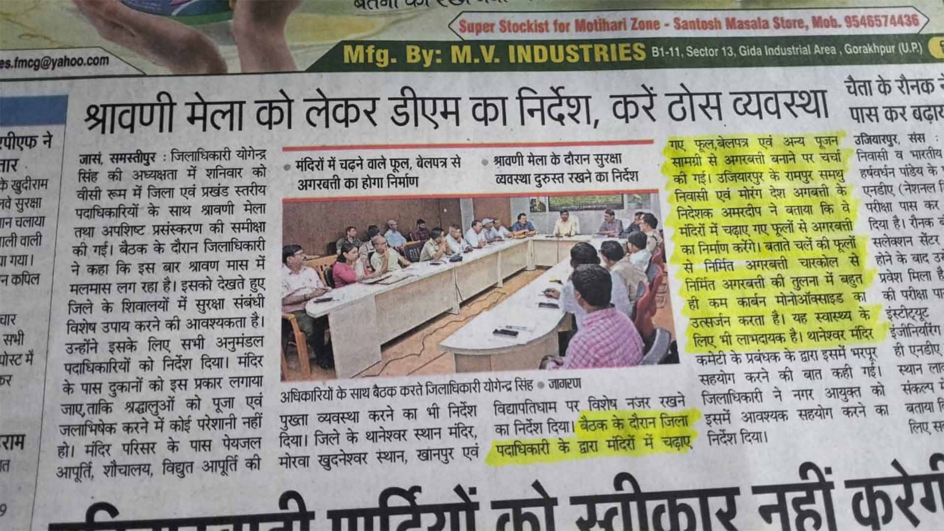 We are honored that our sustainable work model was highlighted during a high-level review meeting chaired by the District Magistrate, Yogendra Singh, regarding the Shravani Mela arrangements. As reported in Dainik Jagran, our company, Morang Desh Agarbatti, was cited as a key part of the solid arrangements for the Mela. Our Director, Amardeep Kumar, noted that we are manufacturing our pure incense sticks from flower waste collected from temples like Baba Balnath. This process not only keeps the temple premises clean but also produces incense that results in very little carbon monoxide compared to conventional charcoal-based incense. We are proud to partner with the district administration to promote cleanliness, sustainability, and devotion during this auspicious month.